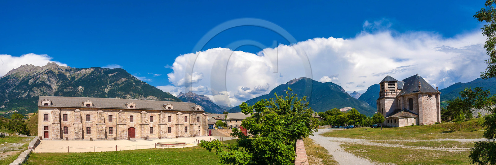 | Description | Hautes-Alpes (05), Guillestrois Queyras, vallée de la Durance, confluence du Guil et la Durance, Mont-Dauphin, village fortifié, la place forte de Mont-Dauphin construite par Vauban à partir de 1693 fait partie des 12 sites majeurs Vauban inscrits en 2008 au Patrimoine mondial de l'UNESCO, l'arsenal et l'église |