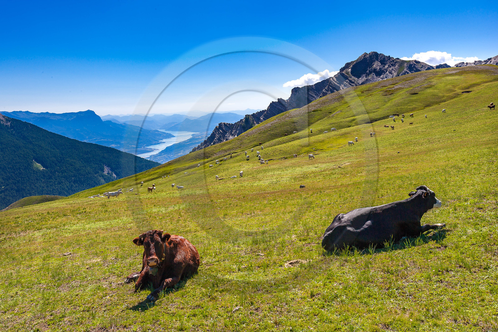 | Description | Hautes-Alpes (05), Guillestrois, Domaine de la Forêt Blanche, Station de ski de Risoul, alpage de Chérines, Belvédère de L'Homme de Pierre avec vue sur le Lac de Serre-Ponçon |