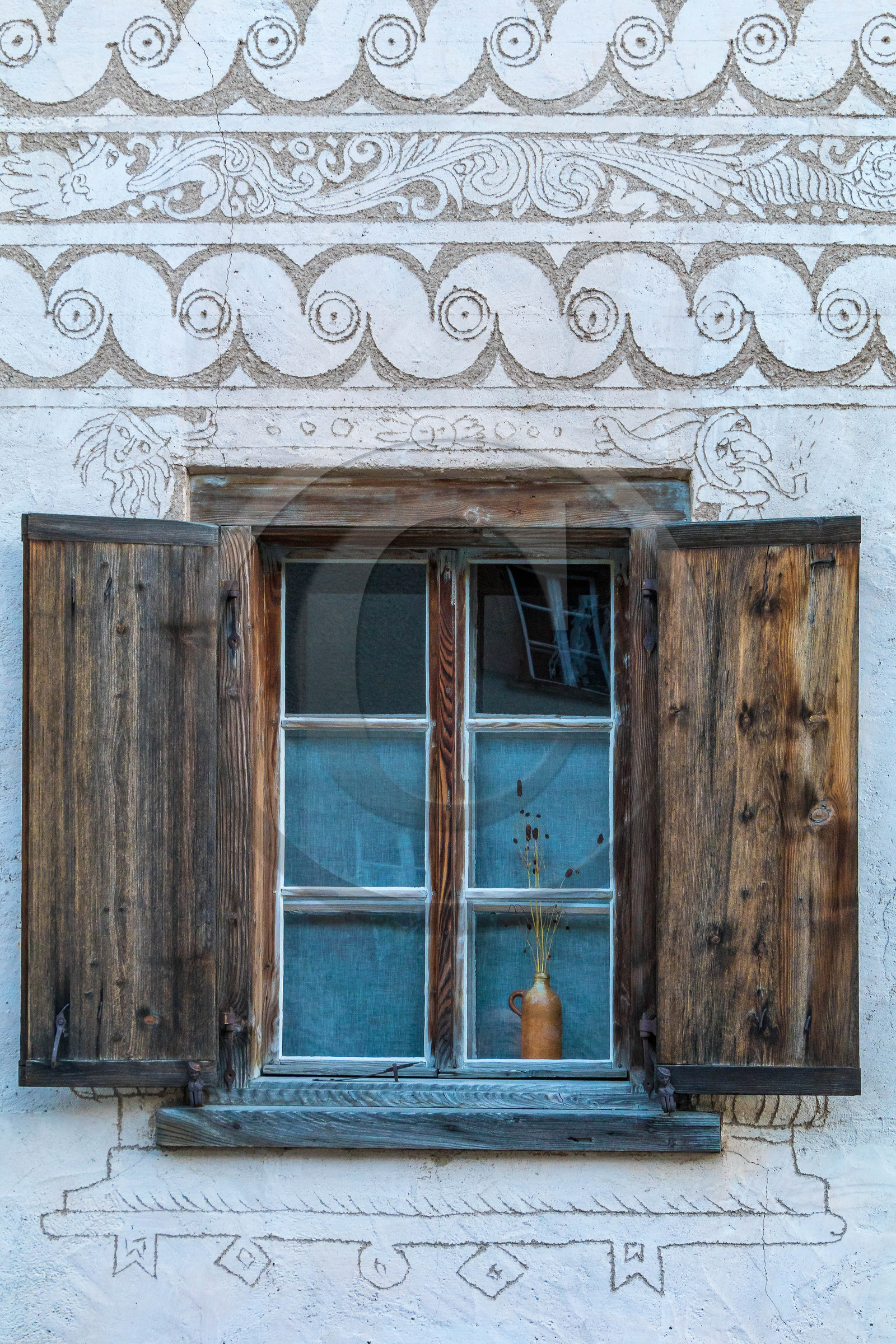 | Description | Switzerland, Canton of Graubünden, Rhaetian Railway, crossing the Alps on board the Bernina Express, UNESCO World Heritage Site, Bergün, Engadinian houses and windows characterized by sgraffites (scratching technique) |
