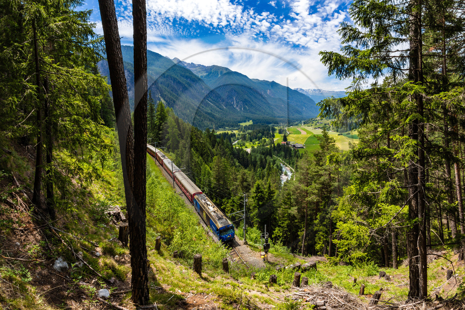 | Description | Suisse, canton des Grisons, Chemins de fer rhétiques, traversée des Alpes à bord du Bernina Express, itinéraire inscrit au patrimoine mondial de l'UNESCO, Filisur, Viaduc de Landwasser |