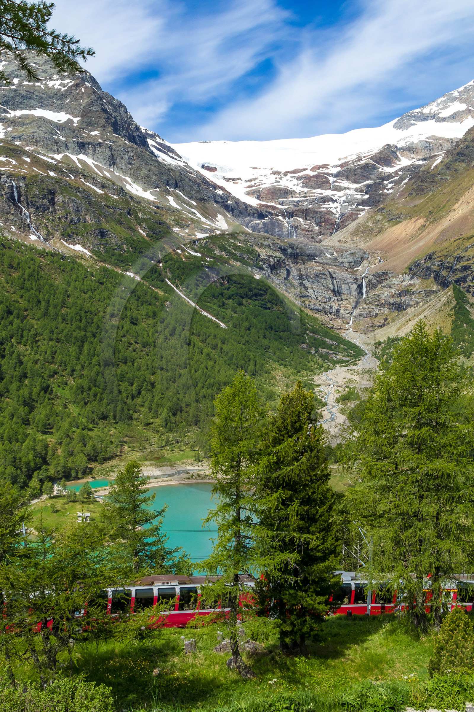 | Description | Suisse, canton des Grisons, Chemins de fer rhétiques, traversée des Alpes à bord du Bernina Express, itinéraire inscrit au patrimoine mondial de l'UNESCO, Alp Grüm, lac Palü |
