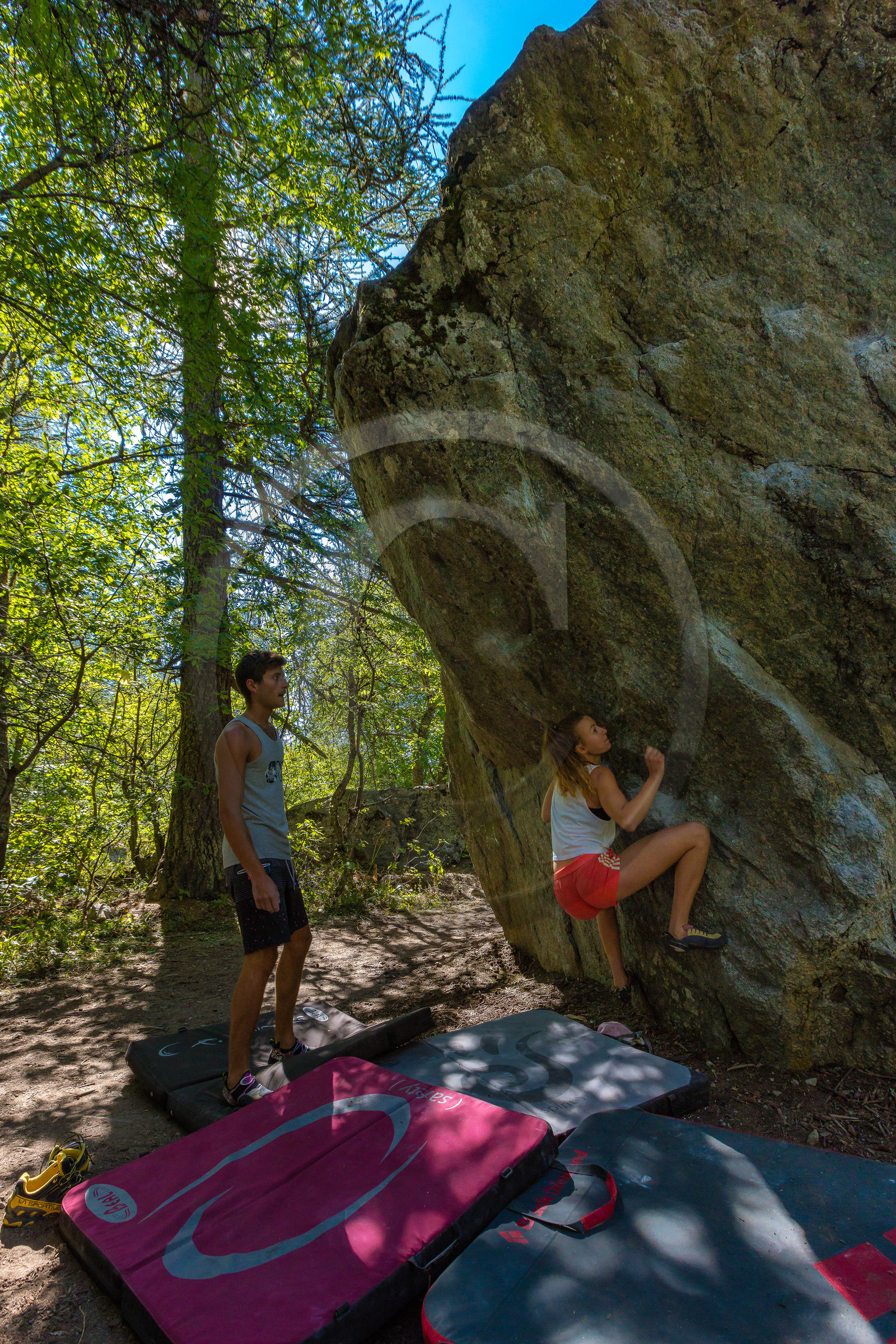 | Description | Hautes-Alpes (05), Pays des Ecrins, Parc national des Ecrins, Pelvoux-Vallouise, Ailefroide, site d'escalade de blocs, Emilie et Quentin sur "champignon" |