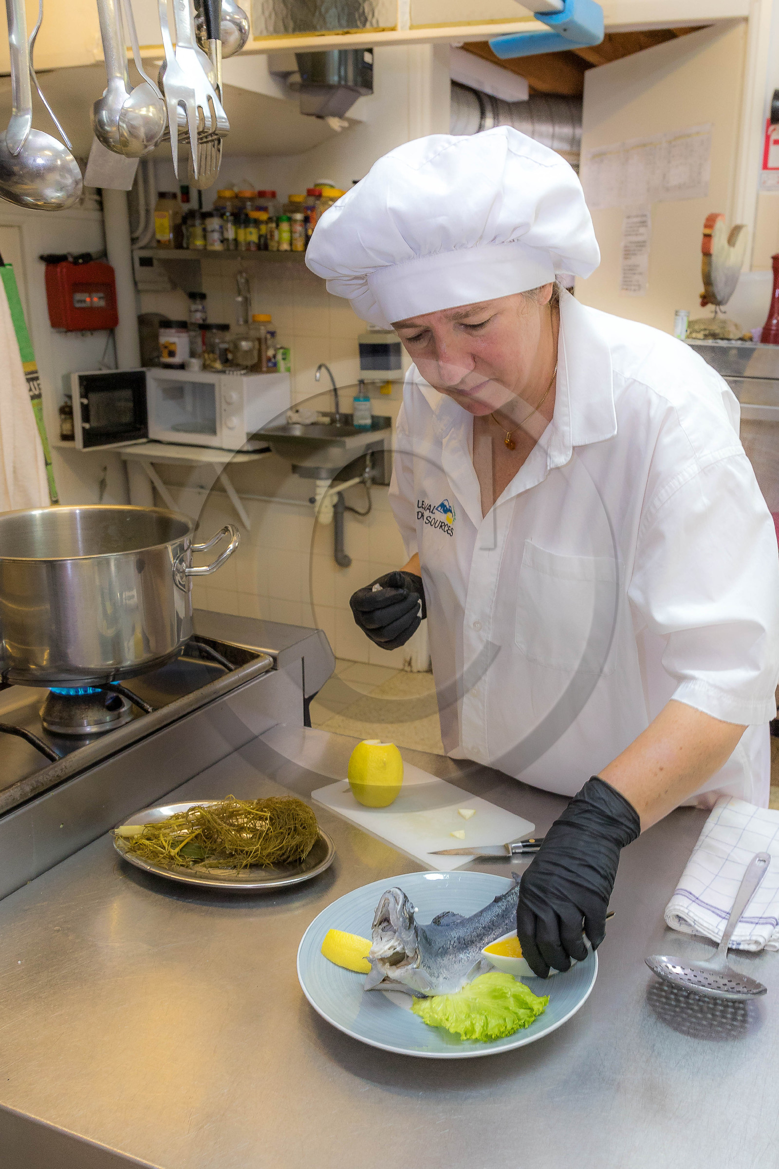 | Description | Hautes-Alpes (05), Parc national des Ecrins, Vallée du Valgaudemar, Saint-Maurice-en-Valgaudemar,Hôtel Restaurant Le Val des sources, Colette Gueydan,préparation de la truite bleue |