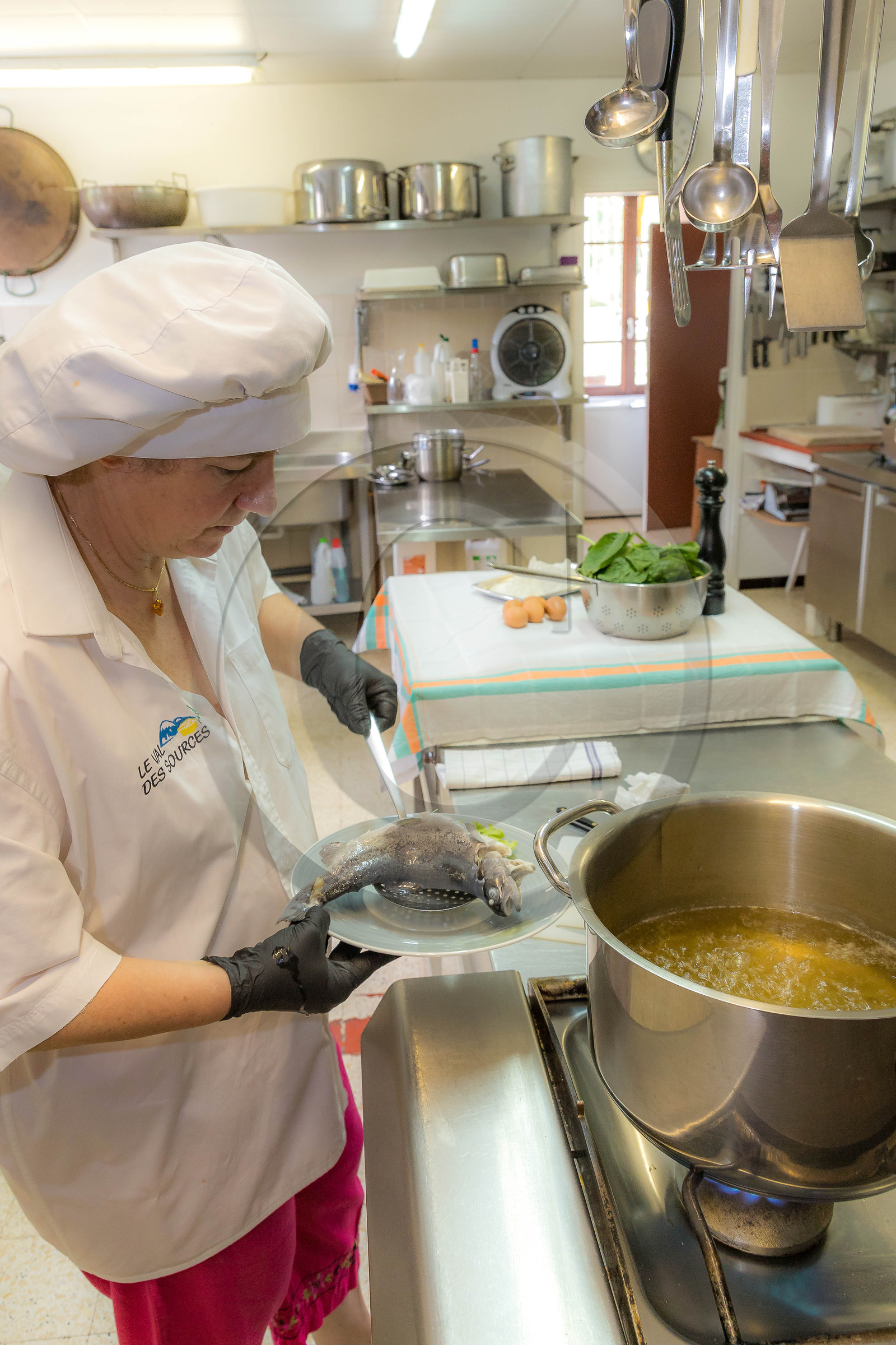 | Description | Hautes-Alpes (05), Parc national des Ecrins, Vallée du Valgaudemar, Saint-Maurice-en-Valgaudemar,Hôtel Restaurant Le Val des sources, Colette Gueydan,préparation de la truite bleue |