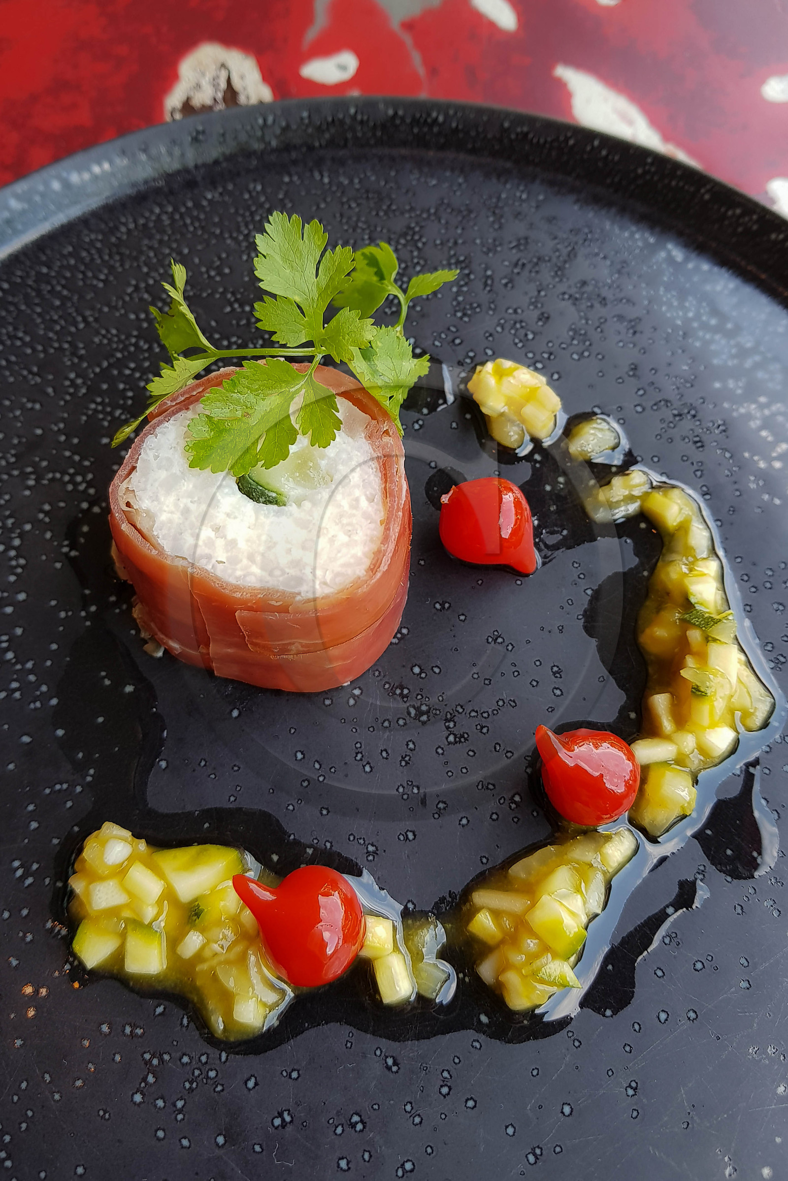 | Description | Haute-Savoie (74), Grand Massif Montagnes du Giffre, vallée du Giffre, Samoëns, Restaurant le 8 M des Monts, Restaurant de produits frais et maison, le chef cuisinier Hugues propose une cuisine créative, originale et savoureuse, réalisée à partir de produits frais et bio, makis savoyards, sauce mangue |