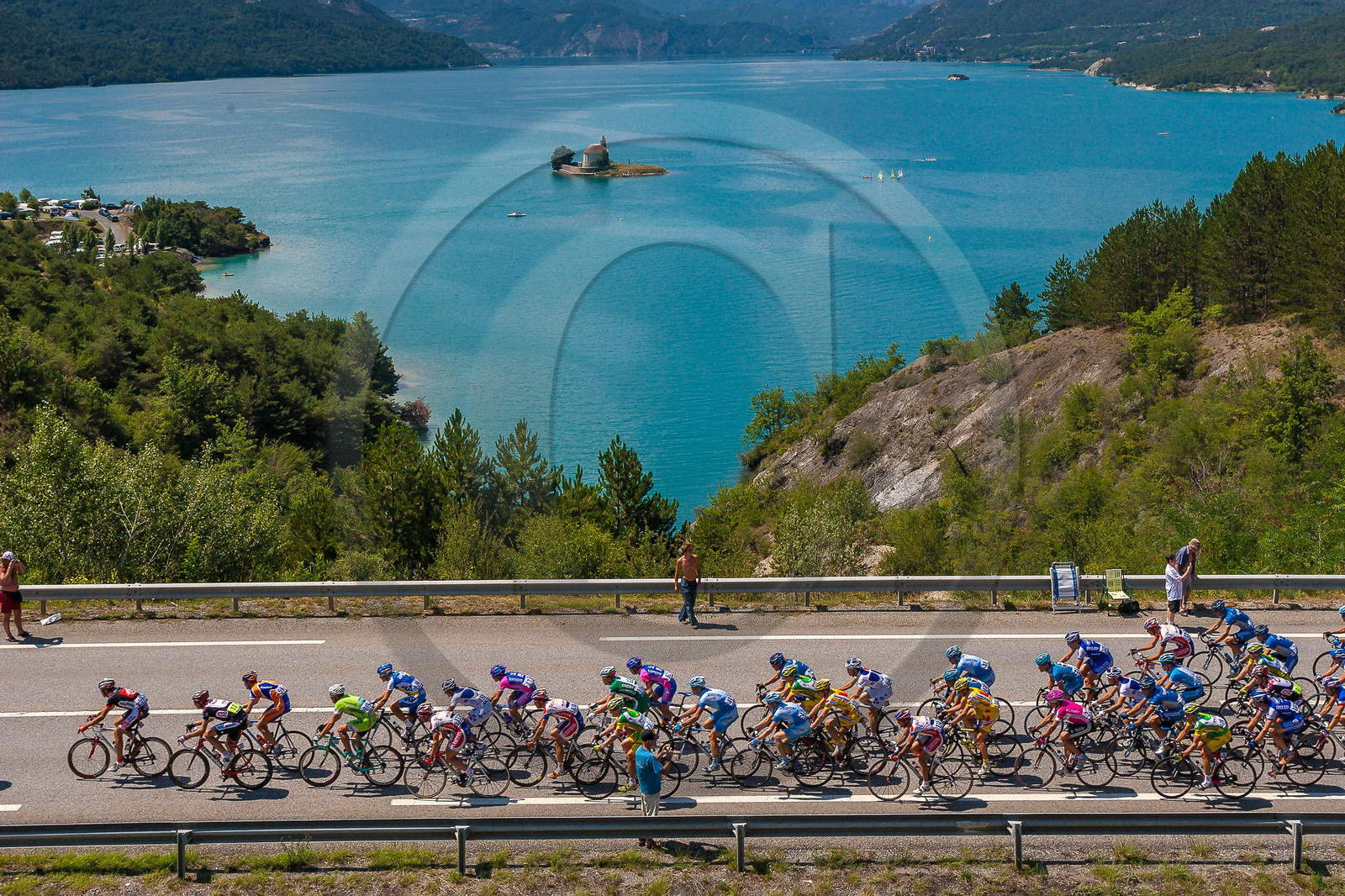 | Description | Hautes-Alpes Lac de Serre-Ponçon, la baie et la Chapelle Saint-Michel, course cycliste Le Tour de France |