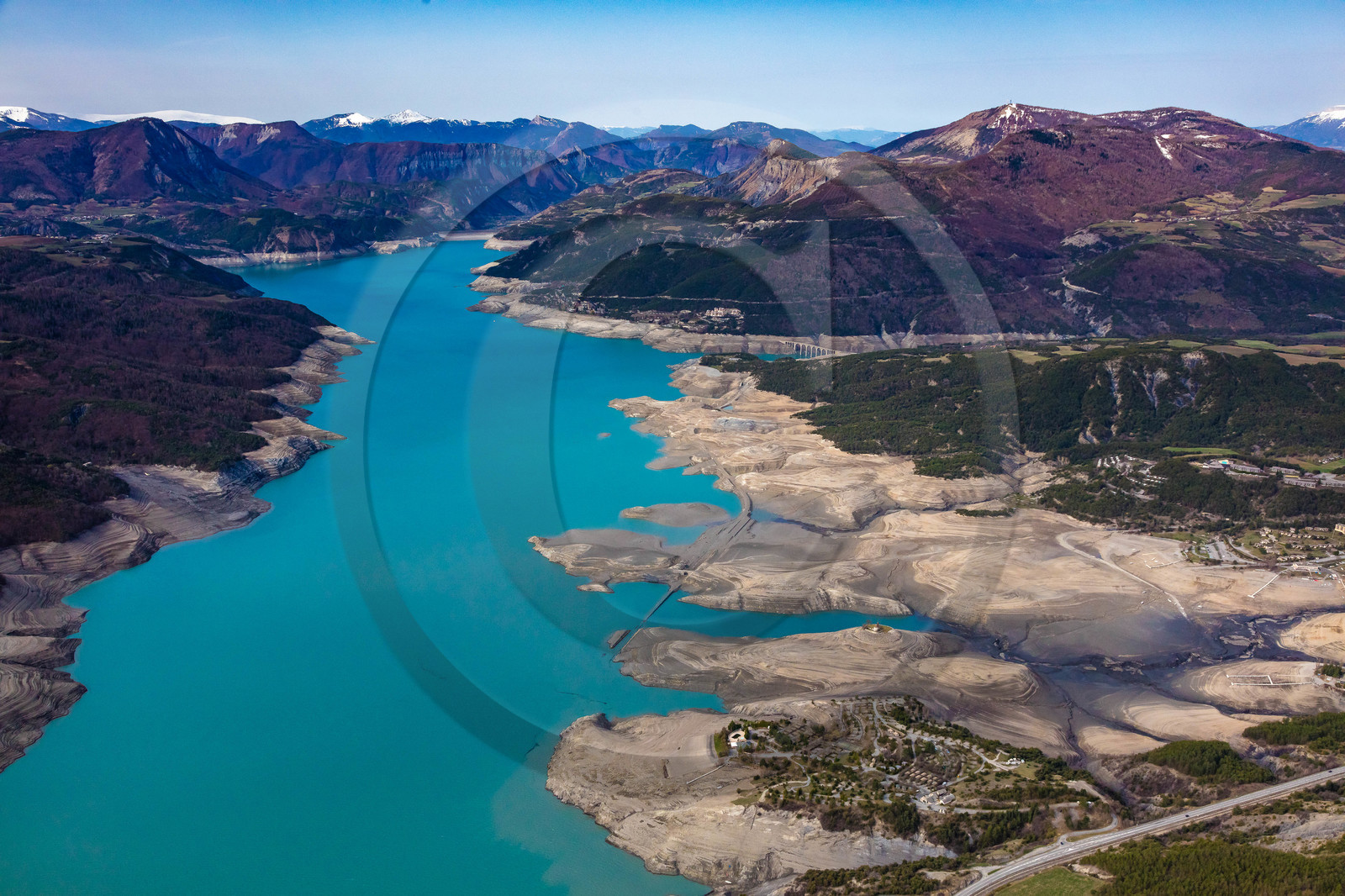 | Description | Hautes-Alpes (05), Pays de Serre-Ponçon, Barrage EDF, Lac de Serre-Ponçon, le niveau du lac est donné en mètres NGF 732 le 15 avril 2018 |