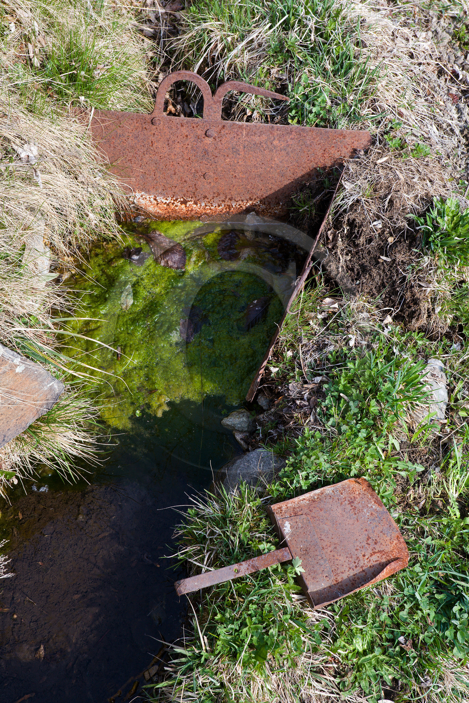 | Description | Hautes-Alpes (05), Guisane, Briançon, réseau des canaux d'irrigation du Briançonnais, canal d'irrigation, Canal Neuf, Rochas Garnier, étanche à poignée et pelle |