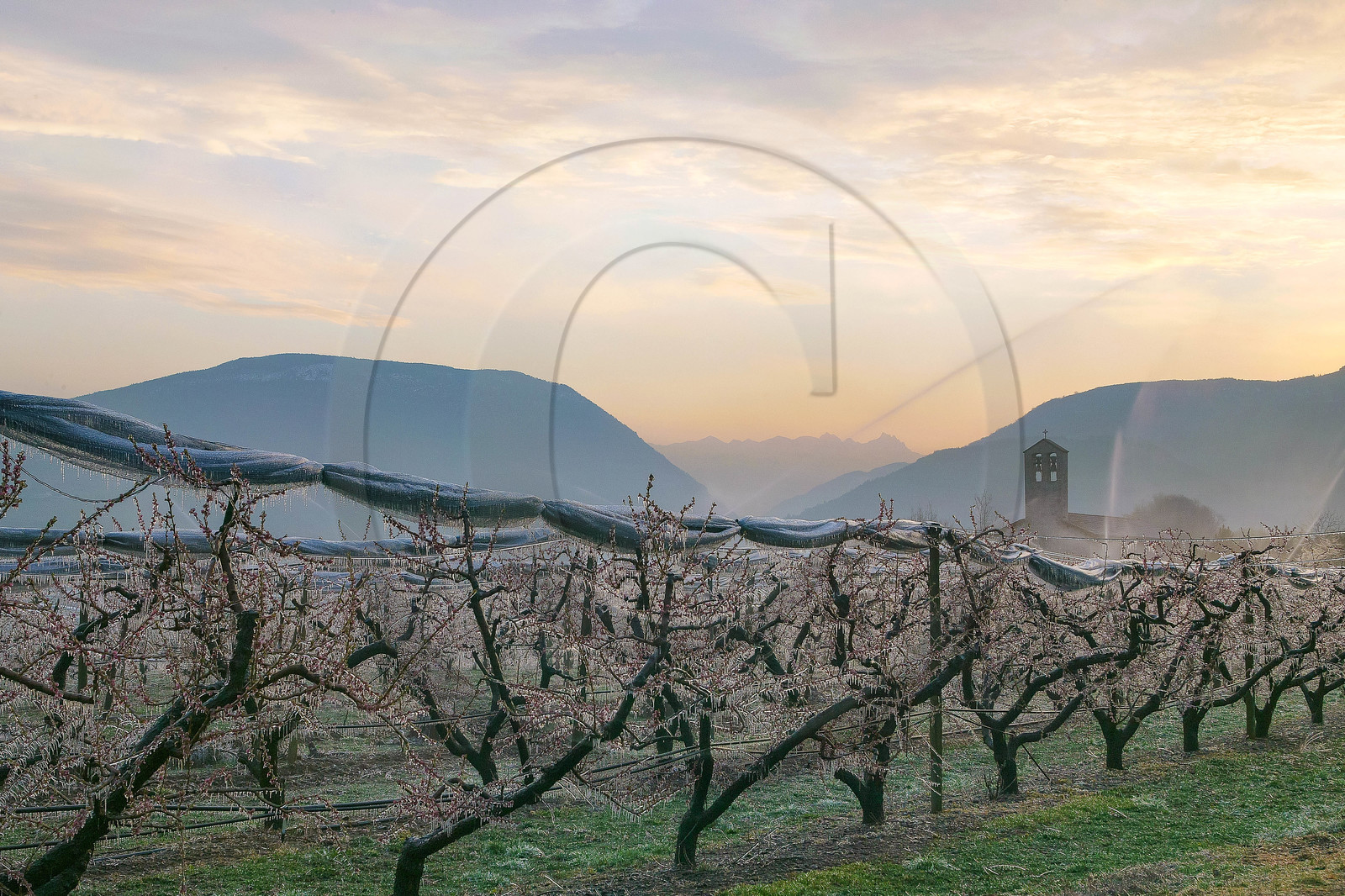 | Description | Hautes-Alpes (05), Vallée de la Durance, arboriculture, verger, arrosage par aspertion pour la protection des fleurs du gel , fleurs de pêcher |